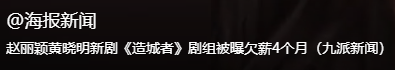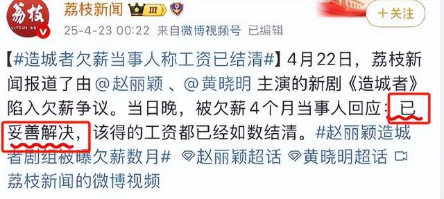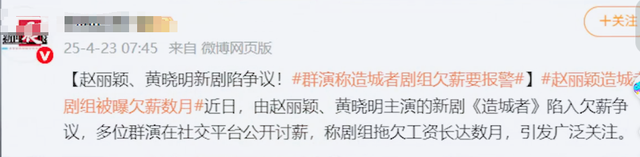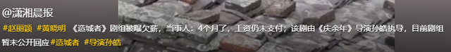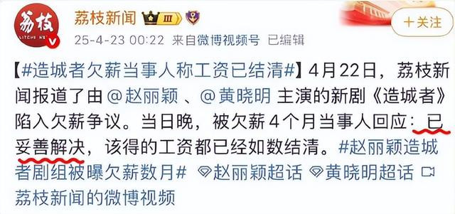 潇湘晨报2025年4月22日 赵丽颖黄晓明《造城者》剧组被曝欠薪,当事人:4个月了,工资仍未支付;该剧由《庆余年》导演孙皓执导,目前剧组暂未公开回应