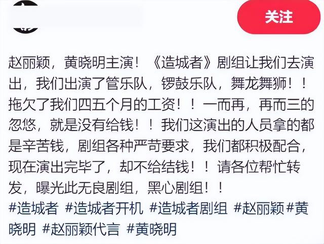 包括上个月的时候,也有疑似剧组雇佣的影视团队连发两条博文控诉该剧组拖欠工资,一直到近日,因为讨薪的剧组员工越来越多,导致“《造城者》剧组被曝欠薪4个月”的相关词条被推上各大平台的热搜,也引发网友对剧组信誉的质疑。