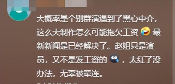 面对剧组员工讨薪的问题,还有网友猜测,这些讨薪的剧组演员可能是是遇到了黑心中介,毕竟这部剧可是千万级别的大制作,怎么可能拖欠工资?